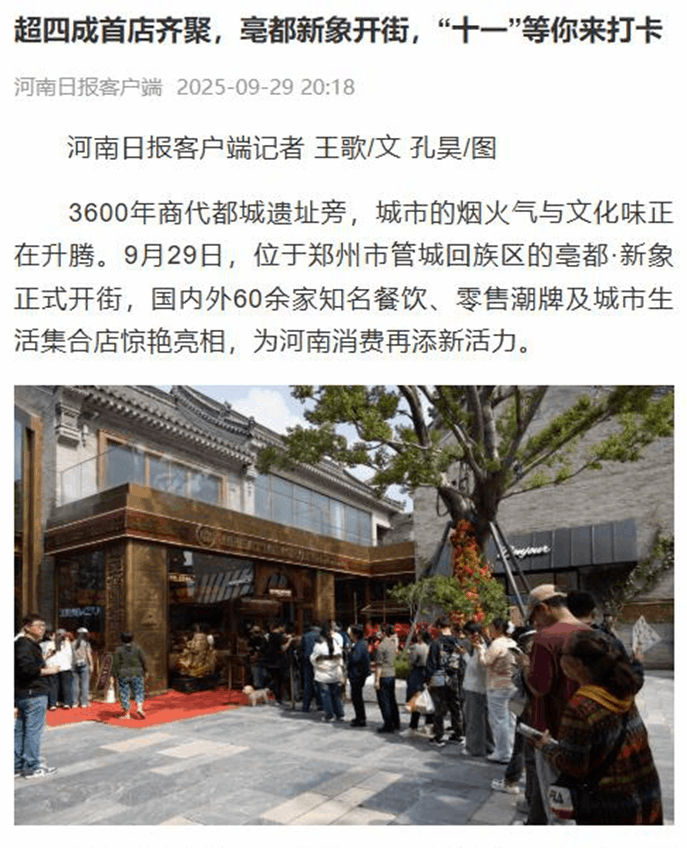 以“傳統(tǒng)風(fēng)貌現(xiàn)代文化商業(yè)街區(qū)”為定位,該項(xiàng)目深度融合3600年商都文脈與現(xiàn)代商業(yè)活力,以40%的首進(jìn)品牌占比和精心策劃的文商旅融合體驗(yàn),為鄭州打造了一張嶄新的城市文化名片。