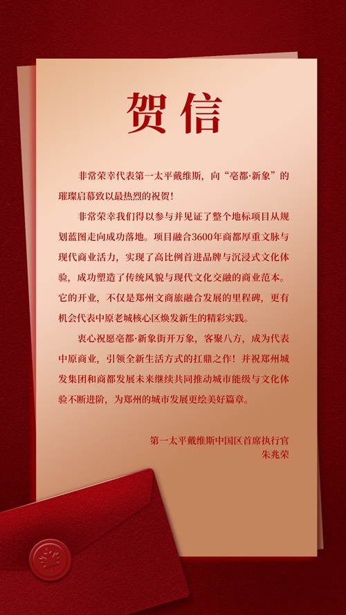 “亳都·新象”由城發(fā)集團(tuán)投資建設(shè),項(xiàng)目的成功開街,不僅是商業(yè)運(yùn)營(yíng)的勝利,更是城市文化與商業(yè)融合發(fā)展的典范。第一太平戴維斯中國(guó)區(qū)首席執(zhí)行官朱兆榮在賀詞中表示,“亳都·新象的開業(yè),不僅是鄭州文商旅融合發(fā)展的里程碑,更有機(jī)會(huì)代表中原老城核心區(qū)煥發(fā)新生的精彩實(shí)踐。”
